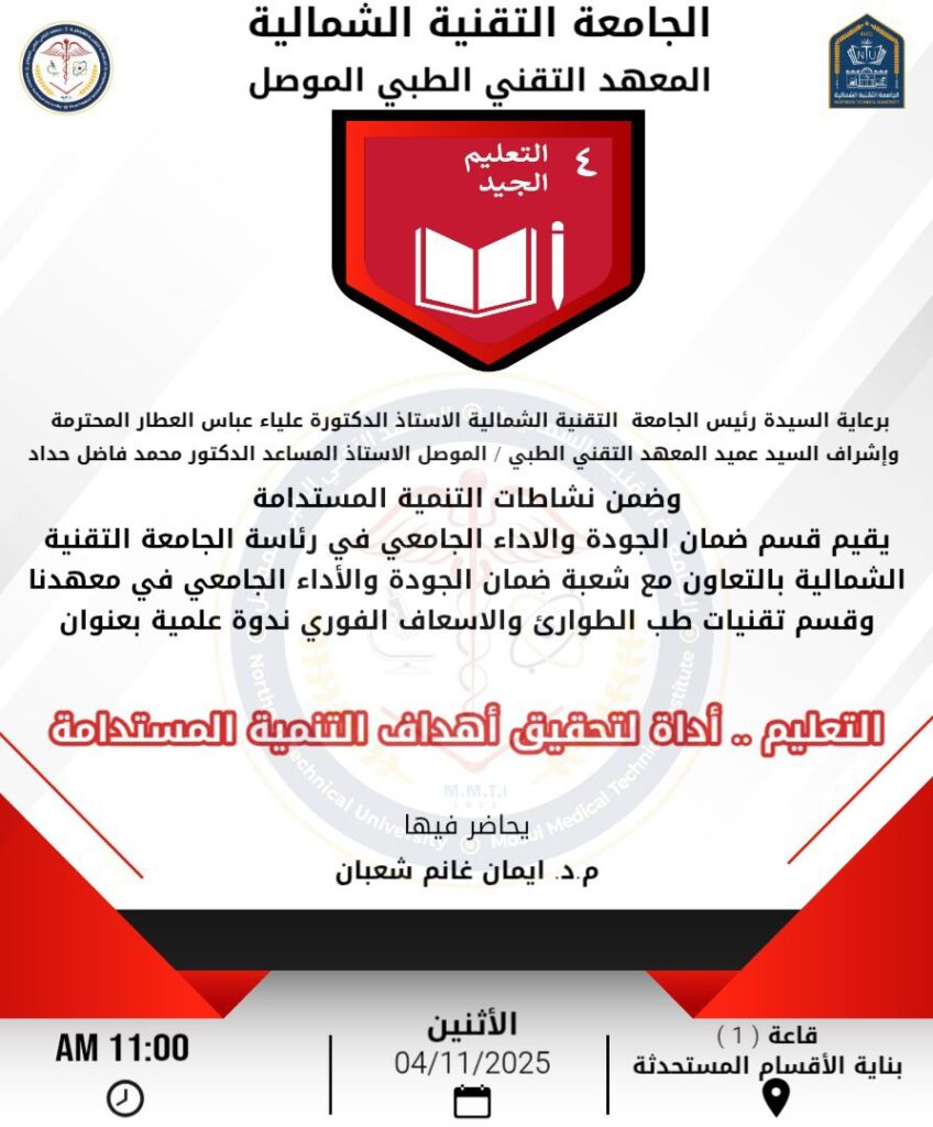 المعهد التقني الطبي/الموصل يقيم ندوة علمية بعنوان “التعليم أداة لتحقيق أهداف التنمية المستدامة” برعاية السيدة رئيس الجامعة التقنية الشمالية الأستاذ