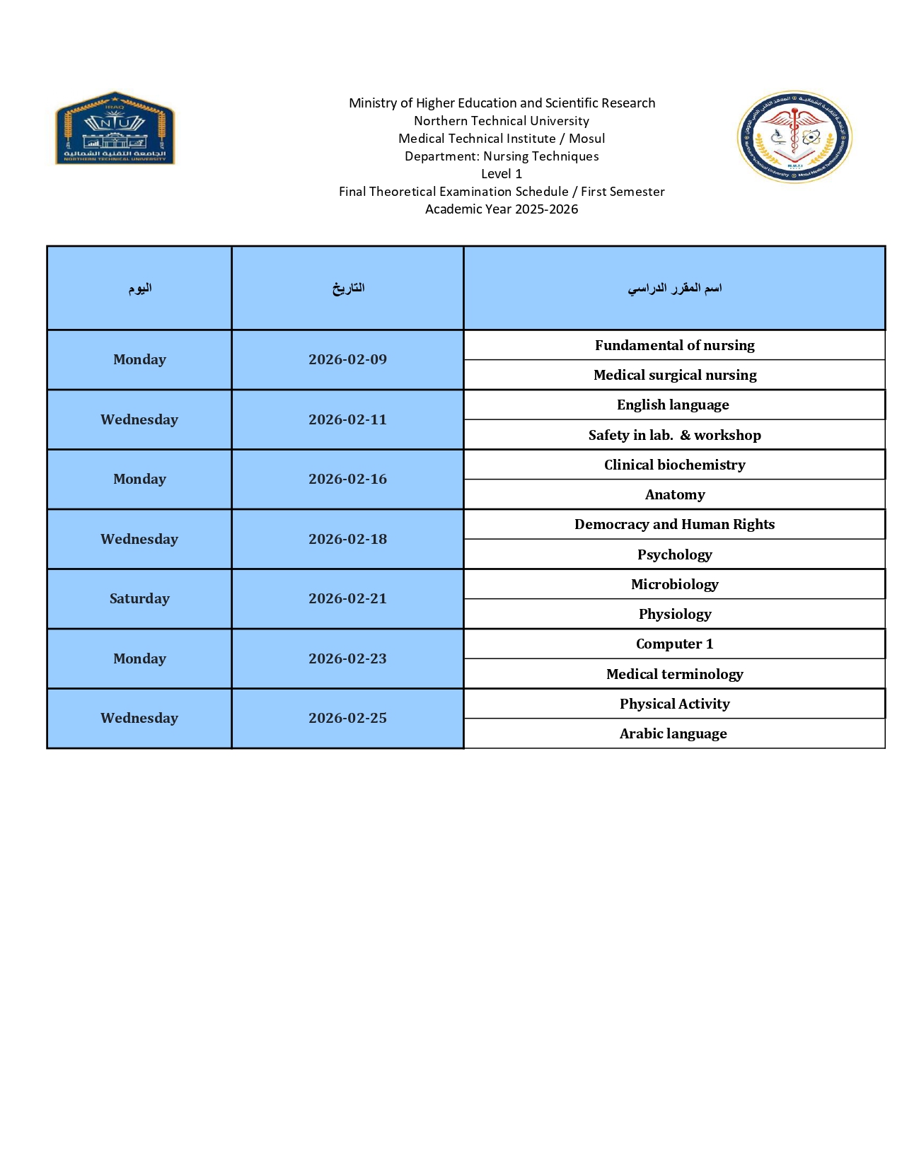 Final Theoretical Exam Schedule/First Semester – Academic Year 2025-2026/Morning + Evening